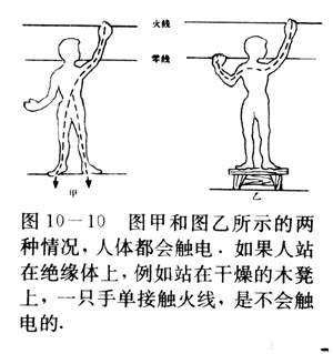 答:我们知道,家庭电路中的两根电线,一根是火线.一根是零线,家庭电路中的触电事故。都是人体直接或间接跟火线连通造成的。站在地上的人触到火线(图10-10甲),或的缘体上同时接触到两根电线(图10-10乙)就有220伏的电压加在人体上。在最不利的情况下,人体的电阻只有1000欧左右,按这个阻值来计算,这时通过人体的电流达220毫安,这样大的电流定会造成融电事故因此,为了安全,绝对不要接触没有绝缘皮的火线以及跟火线连通的身体.