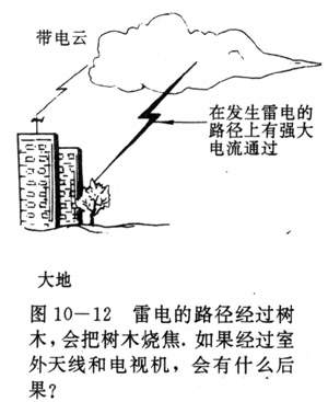 答:是的,要十分重视防雷,雷用是自然界中发生的放电现象。发生雷电时,在云层和大地之间雷电的路征上,有有强大的电流通过(图10-12),会给人们带来危害,雷电的路径往往经过地面上突起的部分.如树木、高大建筑、室外天线等,所以室外天线要装设避雷装置,特别是室外天线架设得比周围建筑物高的情况下,一定要装设。